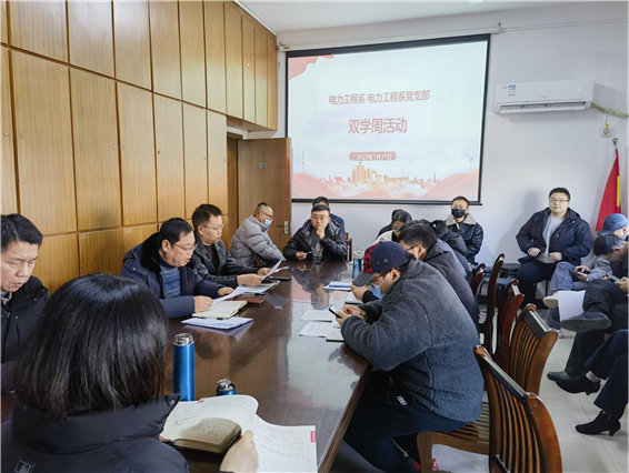 1月31日下午,电力工程系全体员工在五楼会议室,开始了新学期的第一次“双学周”集中学习活动。本次学习由理论学习,安全学习、学习研讨三部分组成。支部书记首先进行了理论宣讲。解读了本次“双学周”工作方案,传达了学院党委专题部署加强理论学习和安全学习、强化作风建设等方面的工作要求,向全体员工介绍了本支部的学习安排计划。他传达了学院“两会”精神,着重对中心(学院)“两会”精神及学校领导调研电力系提出的要求进行了宣贯。理论学习中集中学习了习近平总书记近期的重要讲话、重要文章和重要指示批示精神,观看了共产党员网和中纪委网站的宣传视频。在系部主任的带领下学安全生产有关法律法规,观看了安全生产视频和典型案例警示片并对系部安全责任进行了梳理和要求。主题讨论中围绕“谈谈如何贯彻两会工作部署勇于担当创新突破实现电力工程系高质量发展”,大家畅所欲言。2月1日上午进行了支委扩大会议进行“双学周”第二次集中学习。支部委员、系团总支书记、发展对象、教研室主任参加了学习和工作研讨活动。