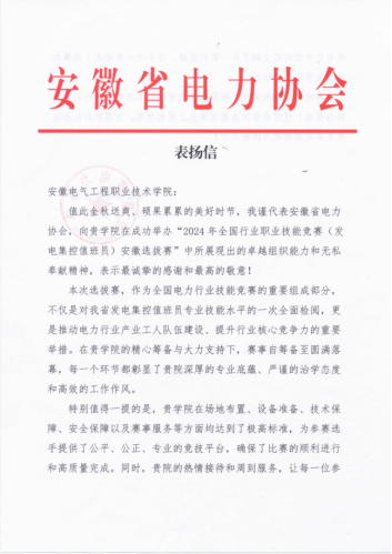 近日,学院收到来自安徽省电力协会的表扬信,信中对学院在全国行业职业技能竞赛(发电集控值班员)安徽选拔赛场地布置、设备准备、技术保障、安全保障以及赛事服务等方面所做出的杰出贡献给予了高度评价与赞扬。