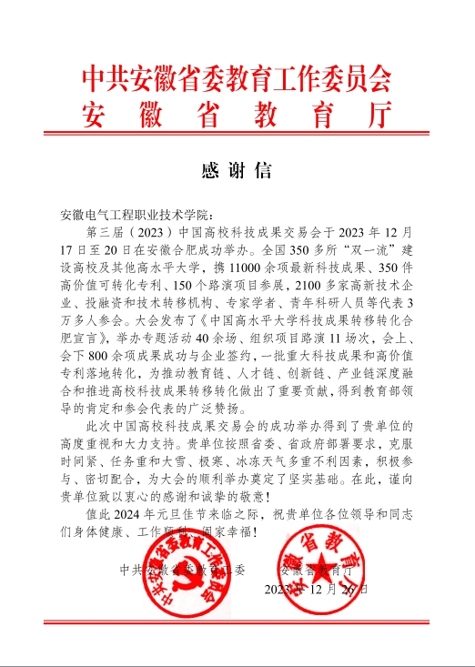 12月26日,省教育厅发来感谢信,对我院为第三届(2023)中国高校科技成果交易会成功举办提供坚实的支撑保障表示高度肯定和由衷感谢。