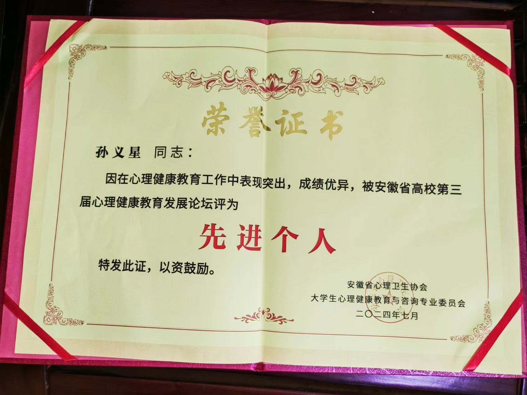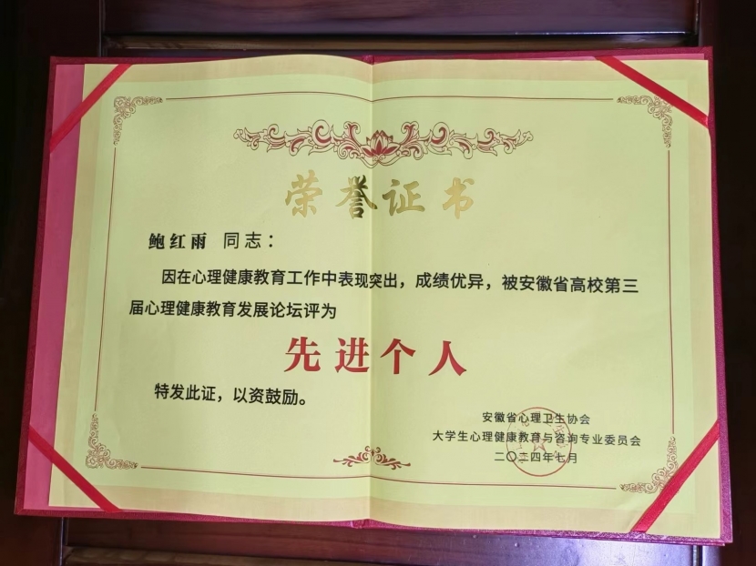 此次会议表彰环节,我院教师孙义星获安徽省心理协会和大学生心理健康教育与咨询专业委员会授予的专(兼)心理咨询师先进个人,鲍红雨获安徽省心理协会和大学生心理健康教育与咨询专业委员会授予的学工人员先进个人。两位教师的获奖,充分肯定了我院心理健康教育工作取得的成绩。下一步,心理健康教育中心将继续学习贯彻落实会议精神和上级文件精神,强弱项,补短板,为全院师生心理健康教育工作保驾护航!