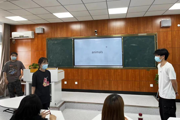 决赛环节分为单词72变、新闻热词、你演我猜、单词“飞花令”四个部分。16名同学分为8组依次上台比拼。单词72变需要选手们在1分钟内尽可能多得在黑板上写出含有所给词根或词缀的单词。新闻热词环节围绕课程思政相关单词,涉及国家方针政策、文化精神等,选手们要说出正确的中文或英文翻译。这考验了选手们对于时政知识的熟悉程度。你演我猜可谓是本场比赛最精彩的环节,选手们在拿到所给单词后需要使用英语并借助肢体语言向队友传递信息。单词“飞花令”则根据中国诗词大会的形式,每位选手根据指定主题说出相关的单词或短语。两名选手互相PK,最终说出正确单词多的选手获胜。