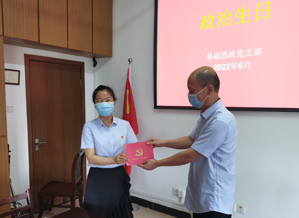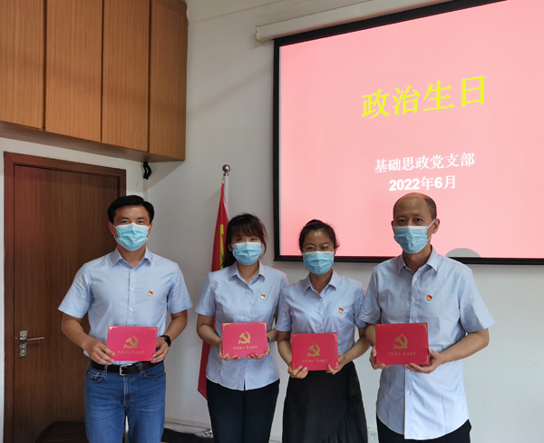 为进一步加强党员教育,增强党员光荣感、自豪感,激励党员同志们“不忘初心、牢记使命”,继续奋斗、砥砺前行,基础思政党支部于2022年6月21日开展主题党日活动,为历年在六月入党的同志过政治生日。