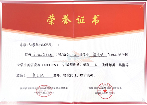 在6月3日落幕的2023年全国大学生英语竞赛(National English Competition for College Students,简称“NECCS”)决赛中,自动化与信息工程系22电气一班的徐文静同学获得D类特等奖。