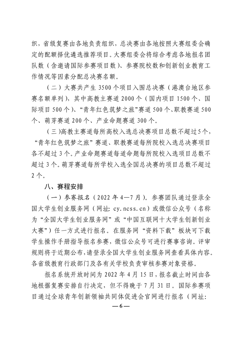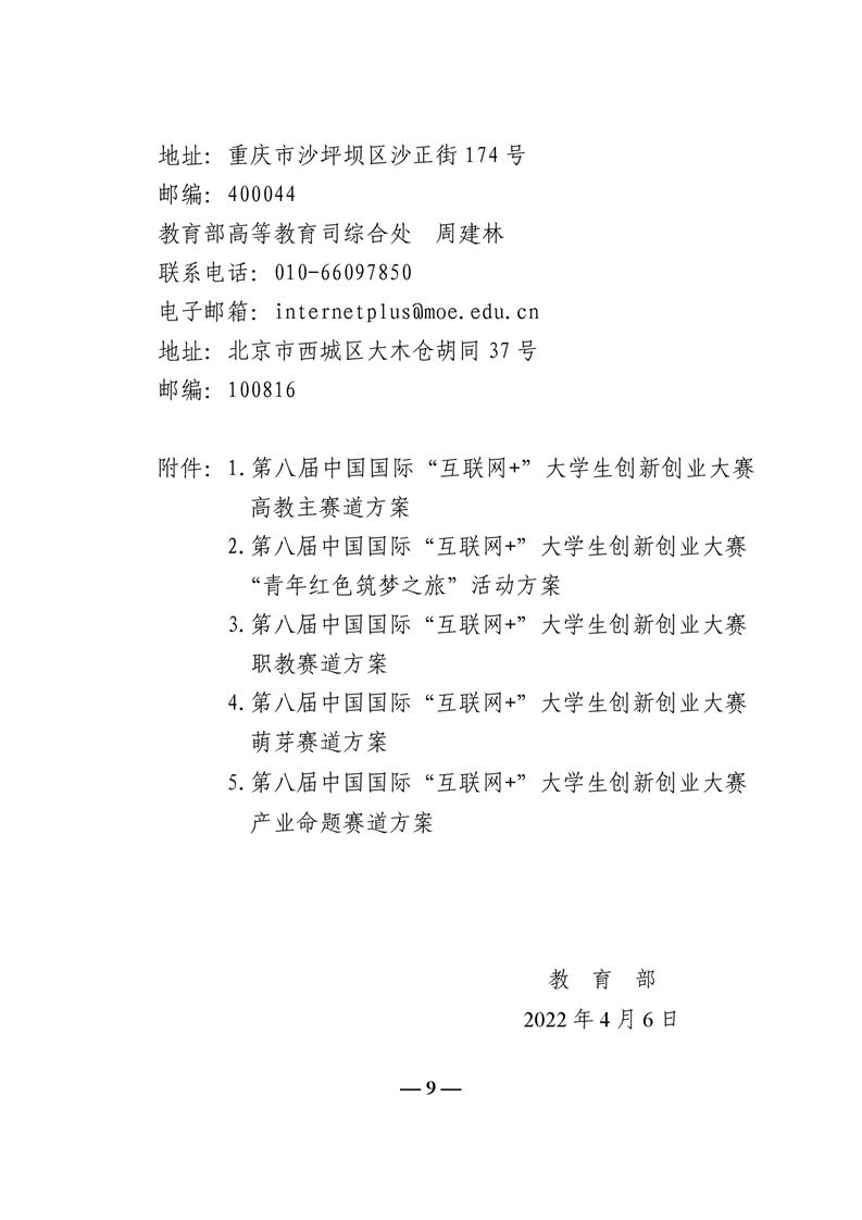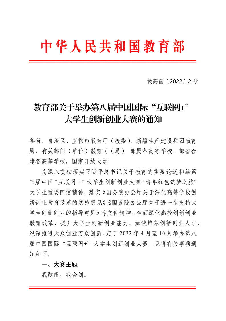 教育部关于举办第八届中国国际“互联网+”大学生创新创业大赛的通知 (教高函[2022]2号)