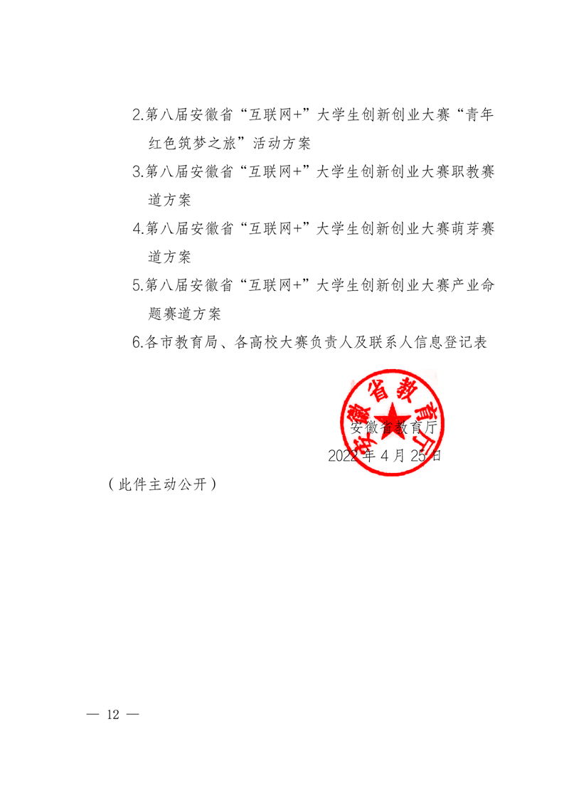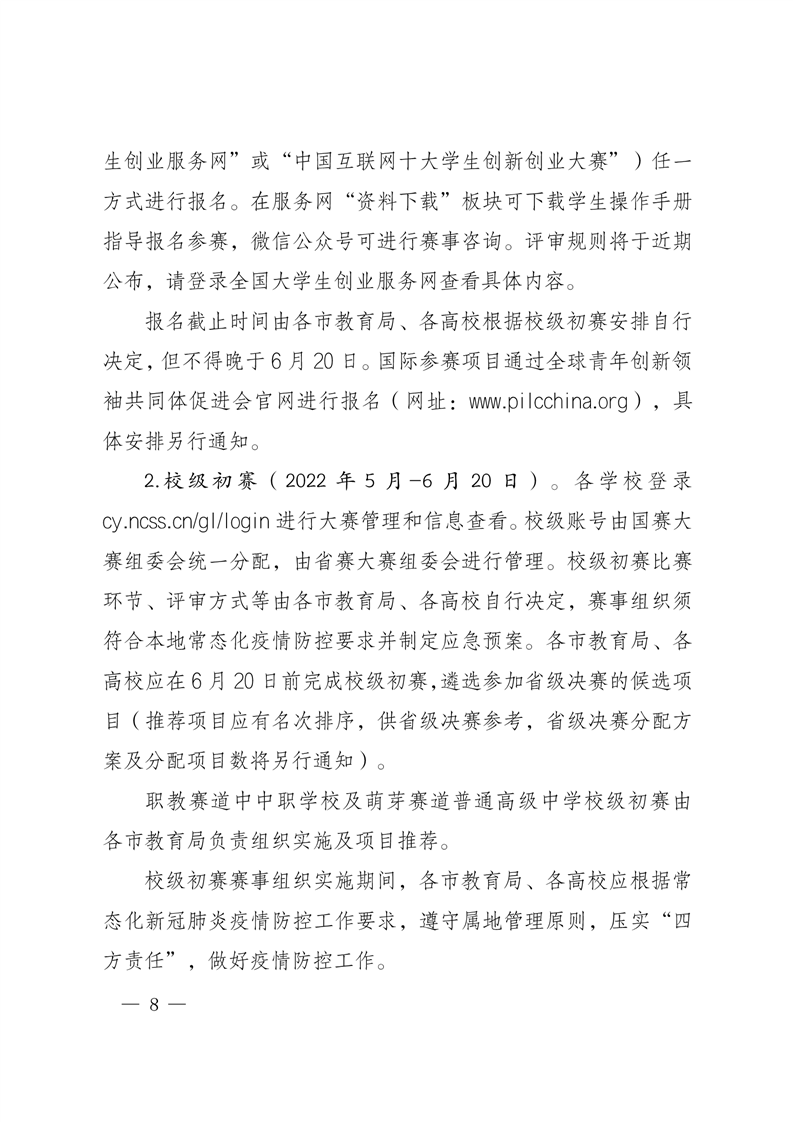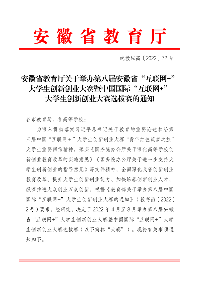 皖教秘高〔2022〕72号-安徽省教育厅关于举办第八届安徽省“互联网+”大学生创新创业大赛暨中国国际“互联网+”大学生创新创业大赛选拔赛的通知