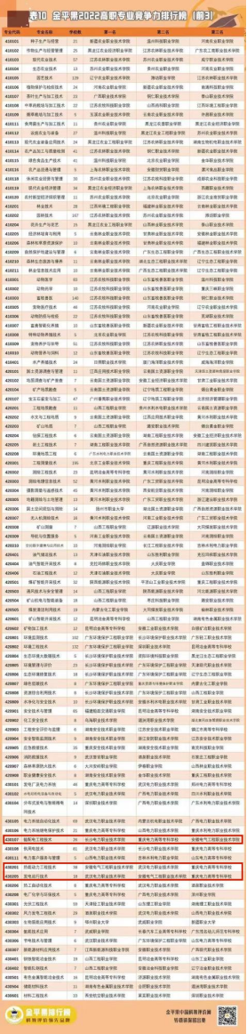 2022年5月21日,“金平果”发布新版目录2022高职专业群及专业排行榜,对包括全国1484所高职院校19个专业大类、97个专业类、731个专业、246个专业群和1065个群内专业的综合实力分布情况,发布综合竞争力评价数据。在“金平果”2022中国高职院校分专业大类竞争力排行榜(表4)中,学院在能源动力与材料大类(代码43)排名全国第四;学院在“金平果”2022中国高职院校分专业类竞争力排行榜(表5)中,热能与发电工程类专业(代码4302)排名全国第三;学院在“金平果”2022中国高职院校分专业竞争力排行榜(表10)中,热能动力工程技术专业(代码430201)排名全国第一、发电运行技术专业(代码430205)排名全国第二、输配电技术专业(代码430107)排名全国第三。