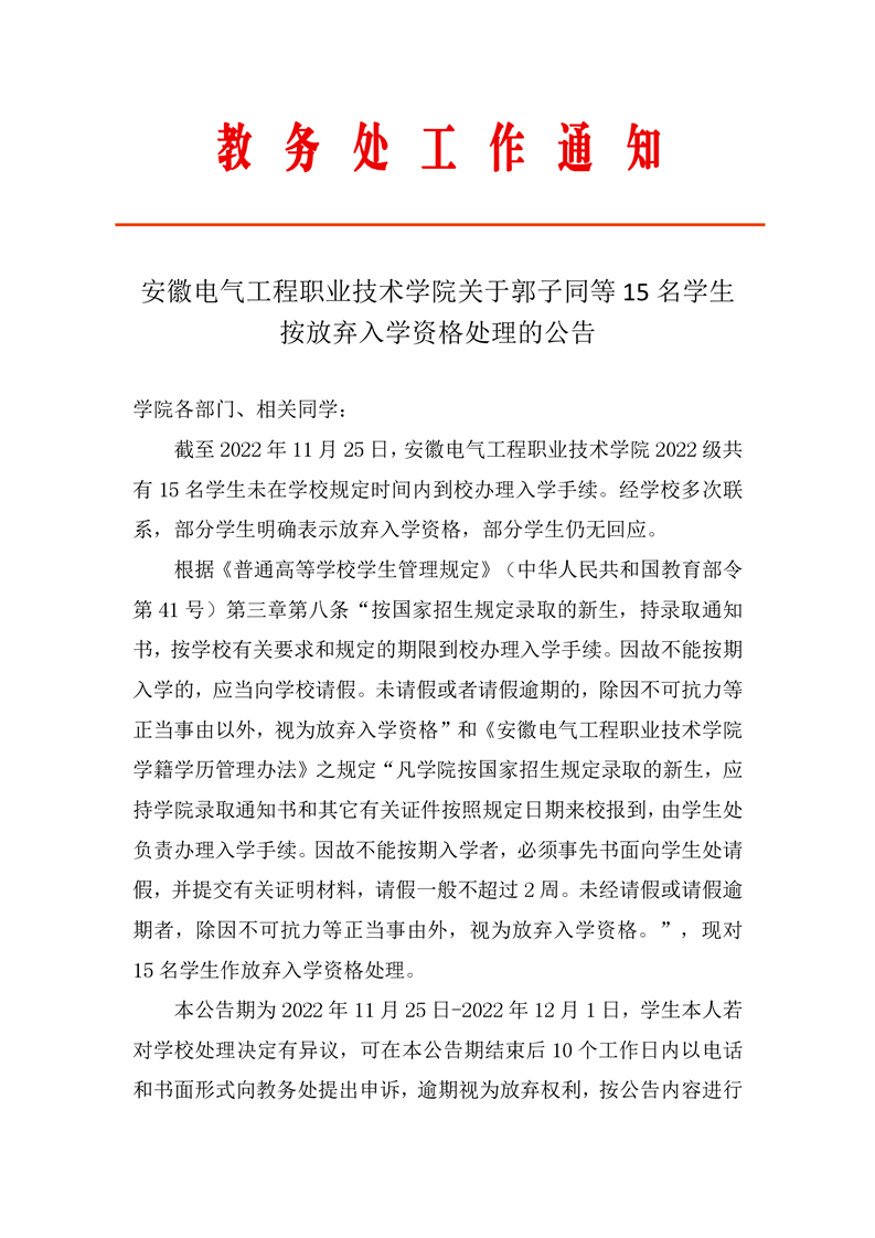 安徽电气工程职业技术学院关于郭子同等 15 名学生 按放弃入学资格处理的公告