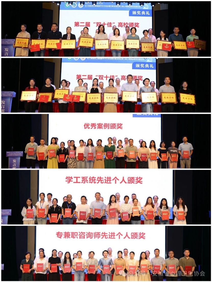 尤其值得一提的是在颁奖会上,我院教师孙义星获得安徽省心理协会和大学生心理健康教育与咨询专业委员会授予的专(兼)心理咨询师先进个人,鲍红雨获得安徽省心理协会和大学生心理健康教育与咨询专业委员会授予的学工人员先进个人。两位教师的获奖,充分说明我院心理健康教育工作取得的成绩得到了上级的肯定。下一步,心理健康教育中心将继续学习贯彻落实会议精神和上级文件精神,强弱项,补短板,为全院师生心理健康教育工作保驾护航!(汪邦银供稿 一审孙义星 二审 彭慧)