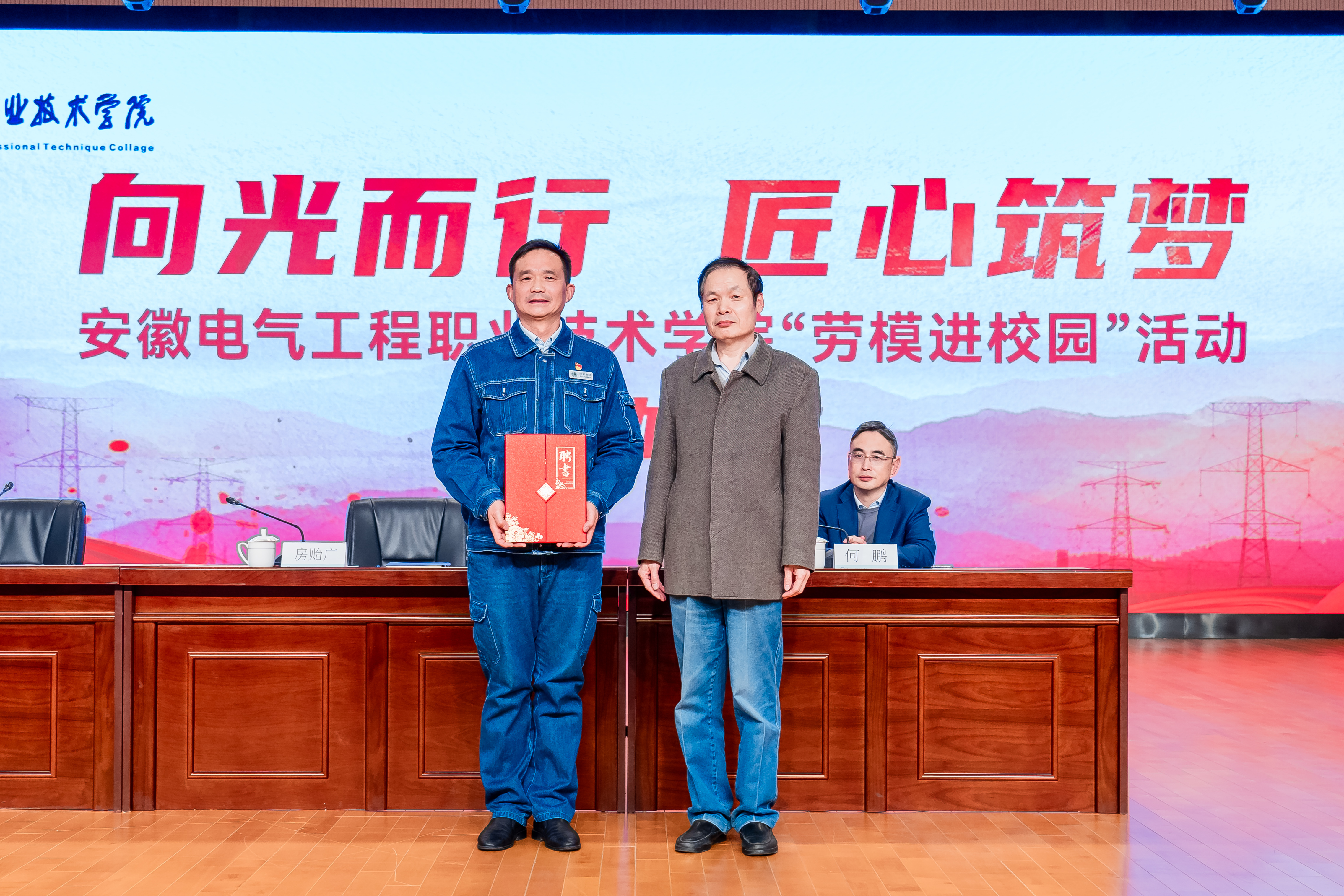 为了学习宣传贯彻党的二十届三中全会精神,全力推动安徽电气工程职业技术学院“三教”改革,加强思政课实践教学,弘扬劳模精神、劳动精神和工匠精神,11月19日下午,学院思想政治教育部组织开展“向光而行 匠心筑梦——劳模进校园”专题活动,特邀全国劳动模范、全国五一劳动奖章、全国技术能手、中国好人、安徽省技术领军人才廖志斌分享其奋斗故事。学院副院长房贻广、教务处处长何鹏应邀参会,思政部负责人、全体思政教师和24级学生全程聆听专家专题报告。