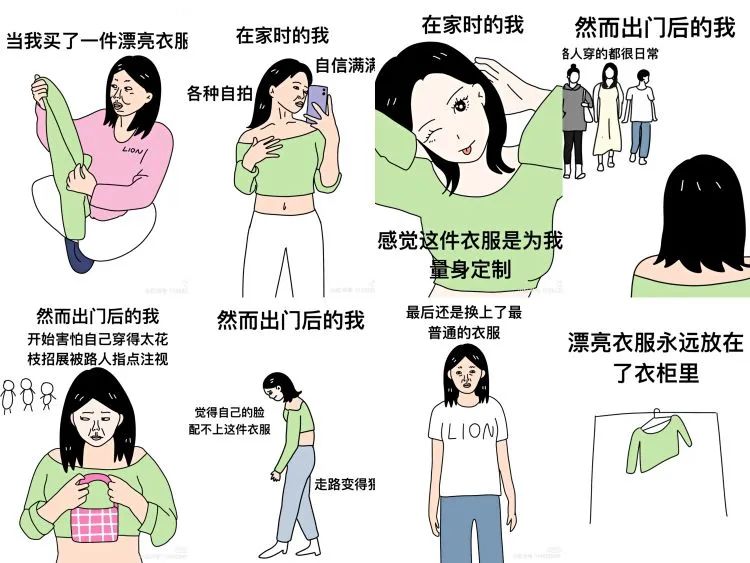 所谓“美丽羞耻症”,是指自己一旦打扮得光鲜靓丽,就局促到不敢出门见人。只有换上T恤、卫裤等普通样式的衣服,才觉得舒服自在。