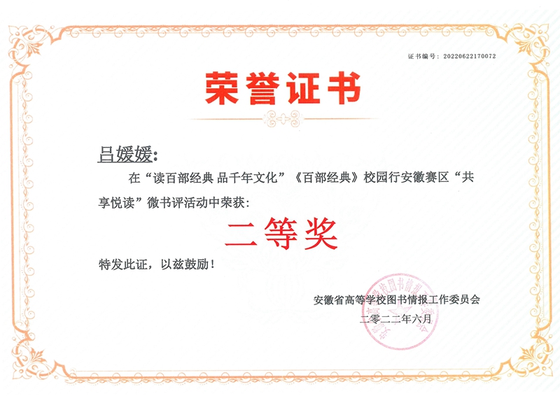 大赛由安徽省高等学校图书情报工作委员会主办,北京一博千禧科技有限公司承办,安徽省各高校图书馆具体组织。本次系列活动由《百部经典》阅读打卡、“经典有声”原著诵读展示、“共享悦读”微书评荐书推广、“百部经典·百题大闯关”传统文化知识竞赛四部分组成。因疫情原因,通过“语林云”线上平台开展活动。参赛时间为2022年1月至2022年4月,评选时间为2022年5月,2022年6月底公布获奖名单。