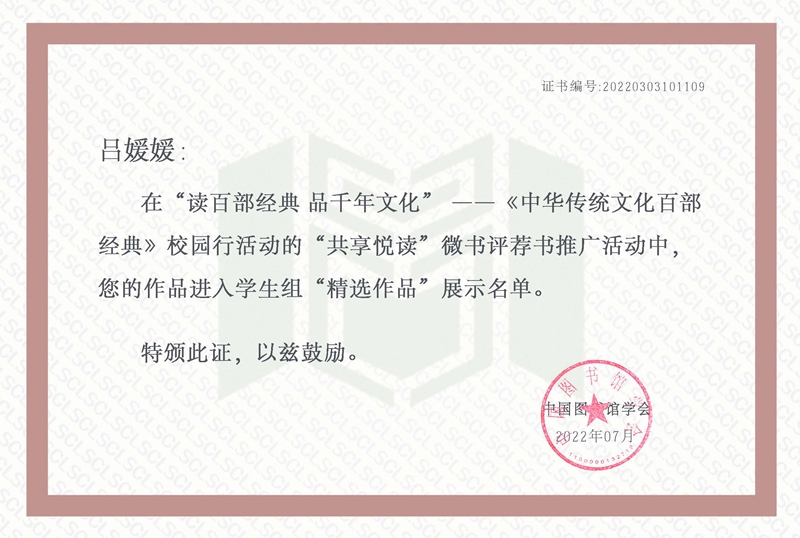 上半年以来,读书协会在指导教师朱靖老师的精心指导下,积极参加本次活动,332名同学参加活动,推荐图书85种,打卡140次,答题100次。我校20集控班吕媛媛荣获《百部经典》校园行活动安徽赛区“共享悦读”微书评活动二等奖,20供电四班柯菊、20集控班吕媛媛、20电自班张旭东获评“百部经典·百题大闯关”传统文化知识竞赛知识达人。今后图书馆将和团委等部门密切合作,持续开展大学生阅读推广活动。