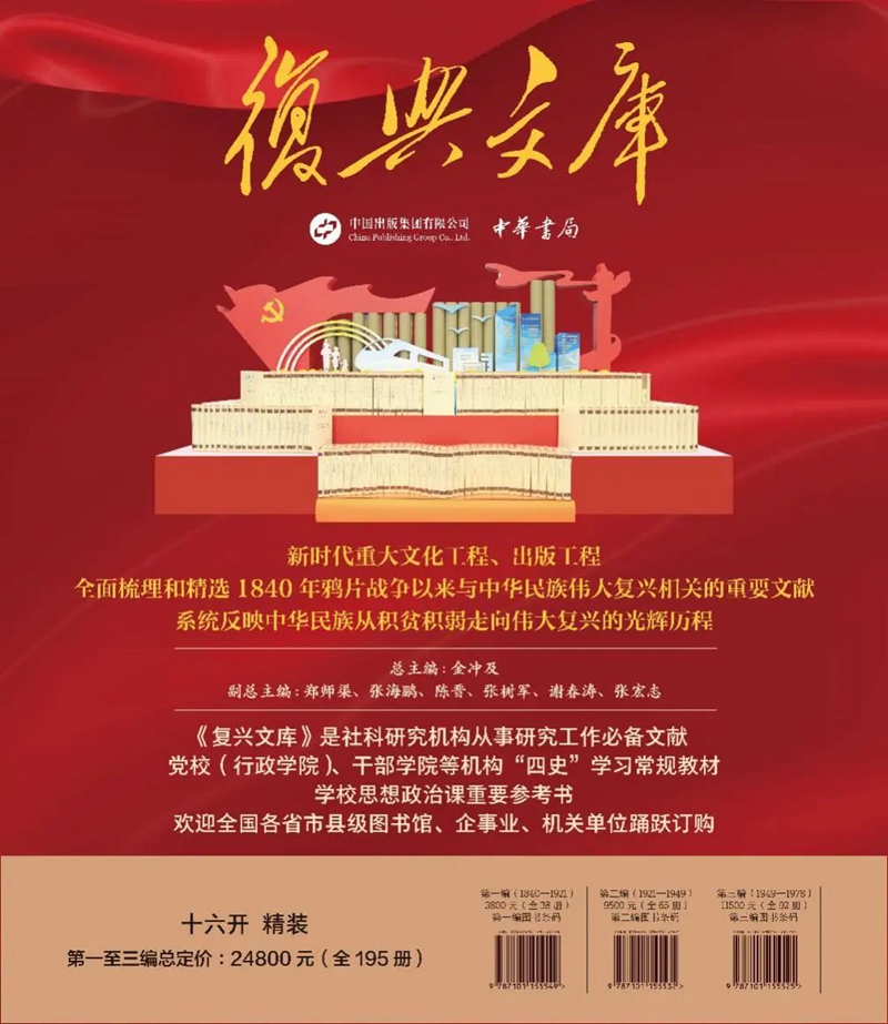 自2017年起,中国出版集团和中华书局就着手准备《复兴文库》前期工作,多次组织专家论证会,讨论、拟定编纂大纲,倾力打造无愧于民族和历史的传世精品,使《复兴文库》成为文献选编出版的重要范本。当前,《复兴文库》第一至三编已出版发行,第四、五编正在编纂。