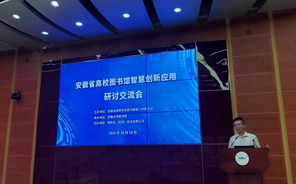 为加强人工智能时代高校图书馆智慧化建设,增进高校馆际交流与合作,凝聚经验,确立品牌,创新服务,助力图书馆高质量发展,2024年10月18日下午在安徽大学磬苑校区文典阁图书馆举办了安徽省高校图书馆智慧创新应用研讨会。本次研讨会由安徽省高等学校图书情报工作委员会主办,安徽大学图书馆承办,阿依瓦(北京)技术有限公司协办。国内图书文献、科学技术情报及人工智能领域专家学者到会做主旨报告,安徽省各高校图书馆馆长、技术部主任及相关工作人员参加会议。