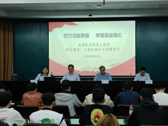 为了帮助广大青年学生更好地了解党的历史和光辉业绩,以及践行初心使命的重要意义。2023年10月31日中午,自动化与信息工程系组织全系入党积极分子、发展对象及学生党员召开“践行初心使命,争做有志青年”党课学习活动。自动化与信息工程系党总支书记姚方方、自动化与信息工程系原书记毕胜、组织委员李俊良、电自电气教研室党支部书记周斌参加了本次活动。